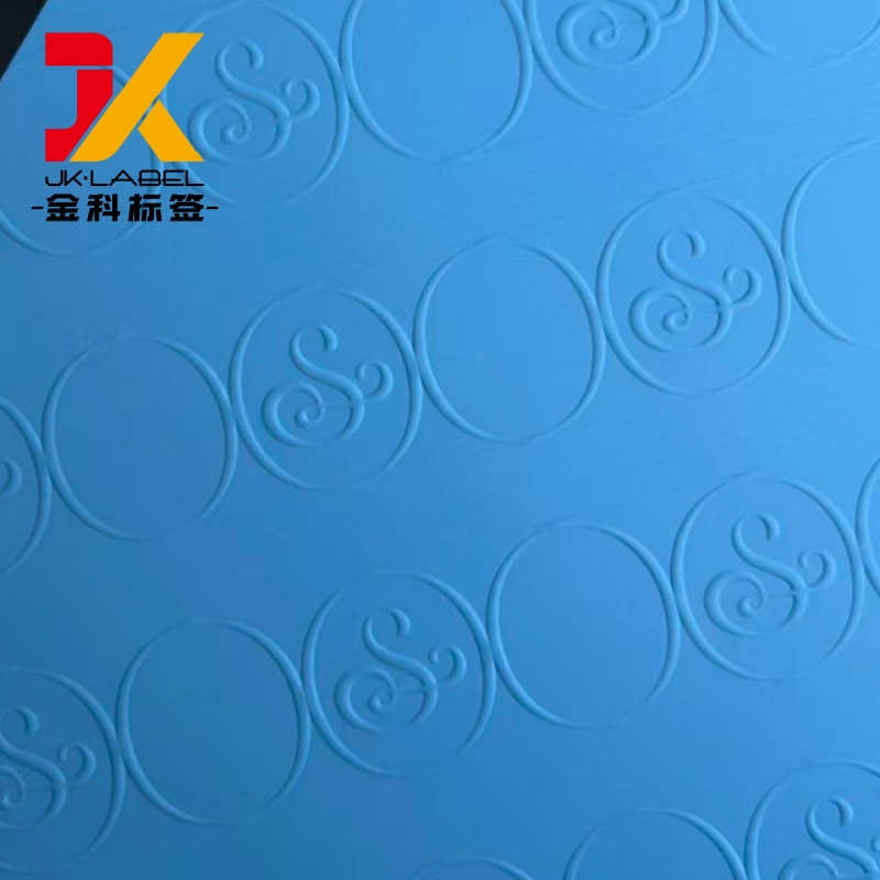 The embossed pattern on the surface creates a subtle three-dimensional texture that improves brand recognition while maintaining a clean and refined appearance. The hot foil stamping elements highlight key brand information such as logos, product names, or certification marks, providing a clear contrast against the matte or smooth background paper.