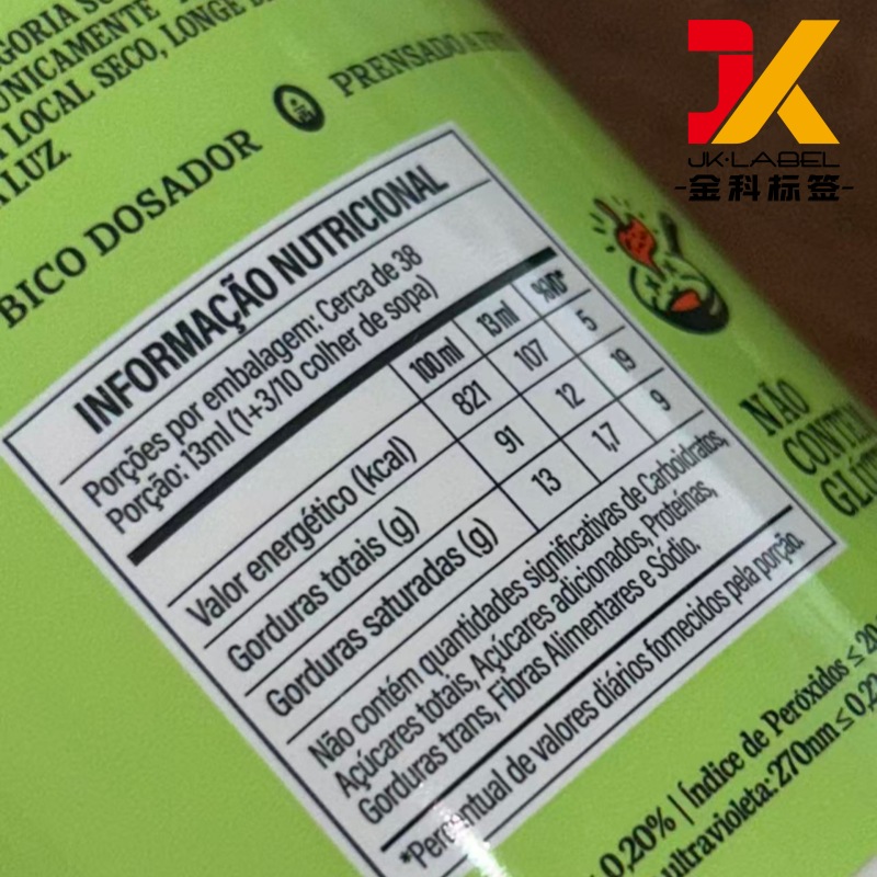 This label is suitable for olive oil, cooking oil blends, dressings, sauces, and other food products requiring clear and durable packaging.